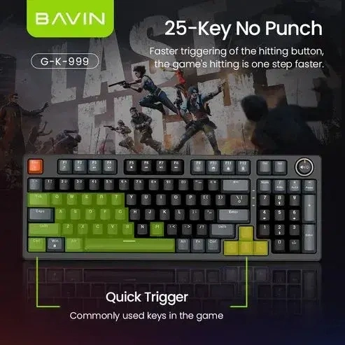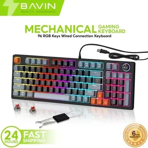 The BAVIN GK‑999 RGB 96‑Key Mechanical Keyboard combines a compact and efficient 96‑key design with vibrant RGB backlighting and multimedia control for enhanced productivity and gaming experience. Featuring multiple customizable lighting modes, this wired keyboard delivers dynamic illumination that can be adjusted to match different moods and environments. Its dedicated multimedia knob provides quick access to volume and media controls, while durable mechanical switches deliver tactile feedback for precise typing and responsive gaming performance. Constructed with long‑lasting ABS keycaps and built‑in plug‑and‑play USB connectivity, the keyboard requires no driver installation and is compatible with most Windows systems and laptops. The robust build quality and high durability make the GK‑999 an ideal choice for users seeking a compact mechanical keyboard with practical multimedia functionality and stylish RGB lighting.