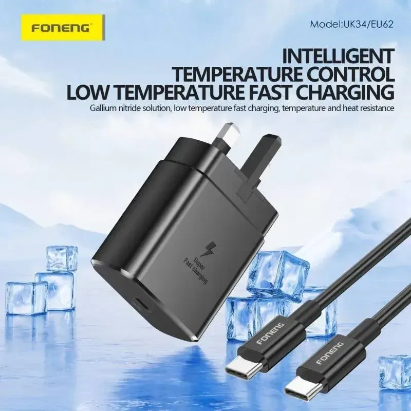 The FONENG UK34 USB-C GaN Charger (45W) is a high-efficiency fast charger that uses advanced Gallium Nitride (GaN) technology to deliver rapid charging performance with lower heat generation. With a maximum output of 45W, it supports wide-range USB Power Delivery (PD) and PPS fast-charging protocols, making it compatible with a variety of smartphones, tablets, and USB-C laptops. The charger features universal 110-240V input for global use and includes a USB-C to C cable (CC cable) for convenience right out of the box. Designed to be compact and lightweight at just under 100g, the UK34 fits easily into travel bags or daily carry. Multiple built-in safety protections ensure secure charging by guarding against over-current, over-voltage, and short circuits. Available in sleek black or white finishes, this charger is ideal for home, office, or travel use.