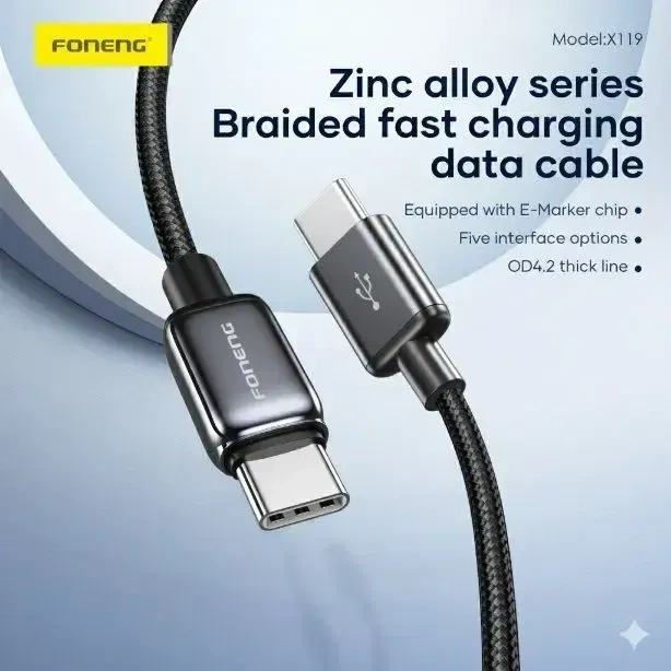 The Foneng X119 1 M Type-C to Type-C braided charging cable delivers reliable 100 W fast charging and data transfer performance for modern USB-C devices. Built with a durable zinc alloy head and premium braided sheath, this cable resists wear, bending and tangling, ensuring long-lasting daily use. The robust OD4.2 thick wire body boosts stability and safety during charging, while universal compatibility keeps your smartphone, tablet or laptop powered on the go. Its sleek and flexible design makes it ideal for travel, office and home charging needs.