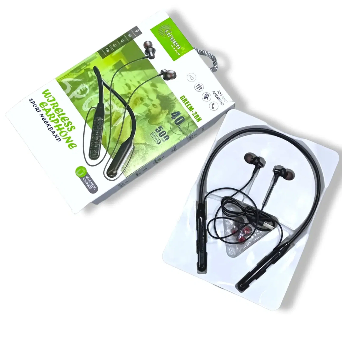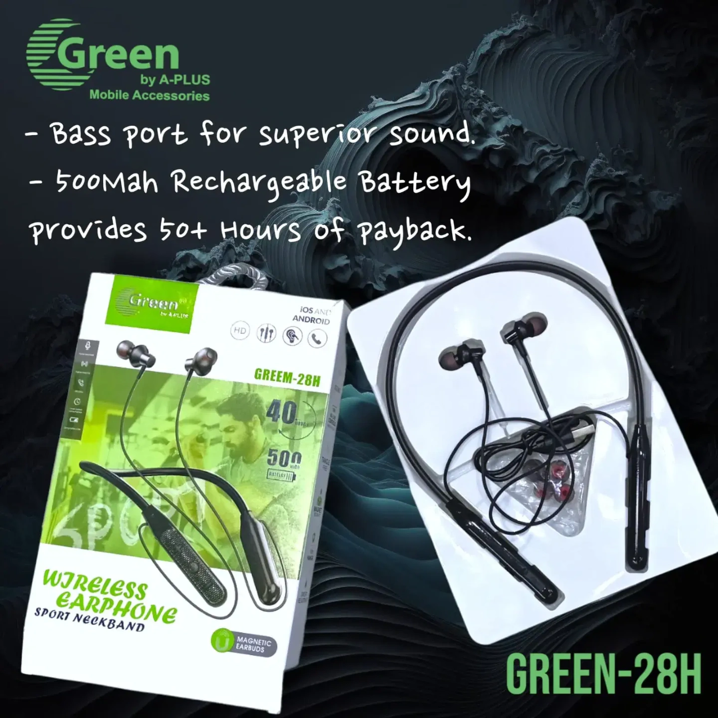 The GREEN 28H Wireless Neckband is a stylish and high-performance Bluetooth audio solution designed for all-day use. Featuring up to 28 hours of battery life, this neckband ensures long playback and call times without frequent charging, making it ideal for travel, work, workouts, or daily commutes. Its deep bass and clear sound profile deliver immersive audio performance across music and calls. The built-in microphone enables hands-free communication, while magnetic earbuds allow convenient on/off control and reduce cable tangling. The lightweight and ergonomic neckband design ensures lasting comfort, and compatibility with most Bluetooth devices lets you pair effortlessly with your smartphone or tablet. Perfectly blending comfort, convenience, and robust audio performance, the GREEN 28H Wireless Neckband is a smart choice for anyone who wants reliable wireless sound on the go.