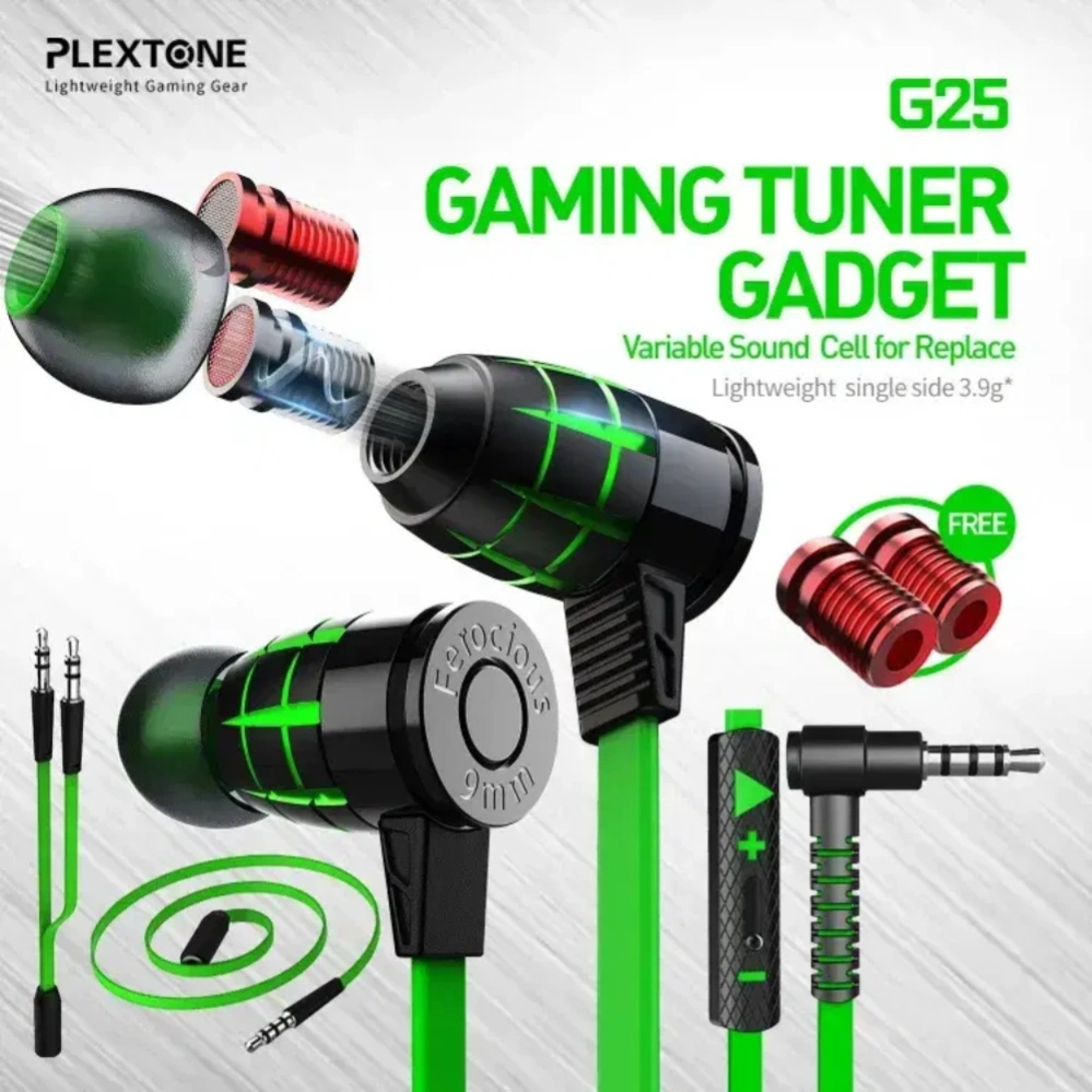 The Plextone G25 is a bullet-style in-ear gaming earphone offering super bass, dual variable mounts to emphasize footsteps or gunfire, magnetic earbuds, and built-in microphone.