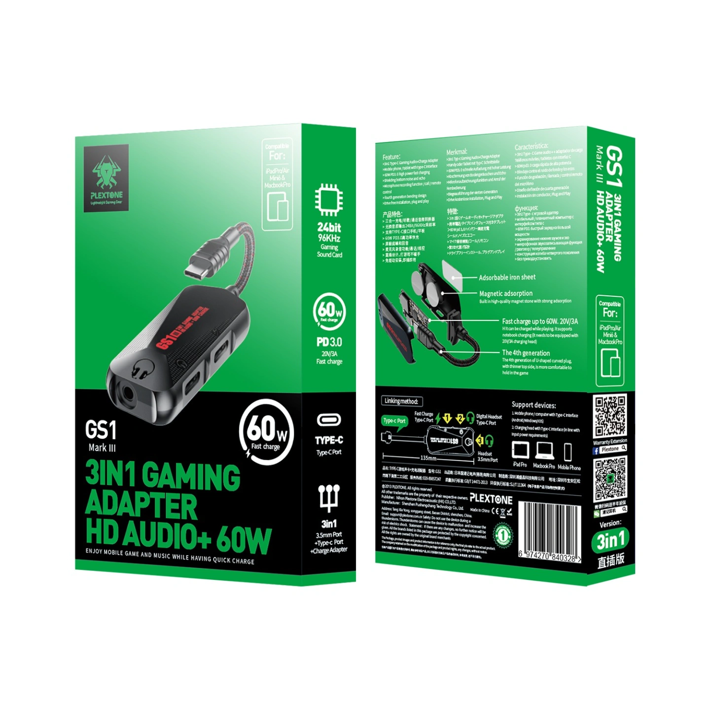 The Plextone GS1 multifunctional Hi-Res sound card enhances your gaming audio experience with PD 60W fast charging, a 3.5 mm audio jack, and Hi-Fi chip output. Compatible with Type-C smartphones, PCs, Xbox, and PlayStation, it delivers superior sound clarity and minimal latency for serious gamers.