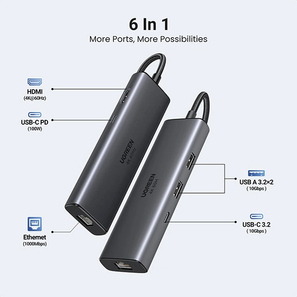 Output: 2× USB-A 3.2, USB-C 3.2, HDMI, RJ45 Gigabit, PD